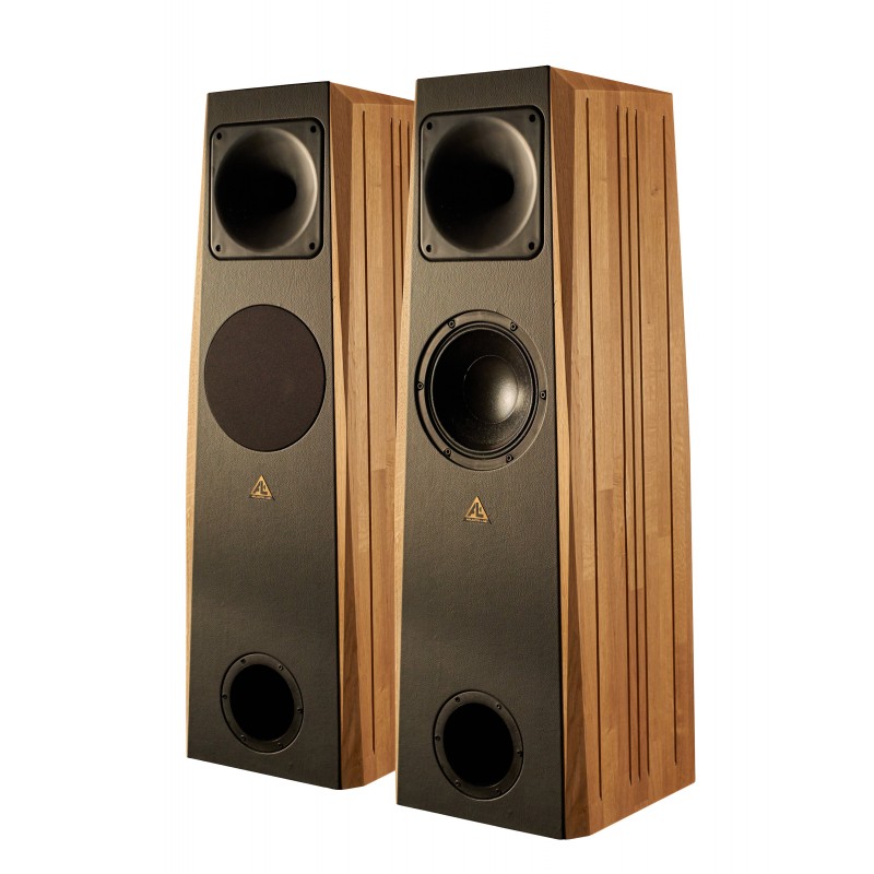 L’enceinte AT23 est une colonne de taille modérée, qui reprend les caractéristiques propres à la marque. Enceinte deux voies, elle compte néanmoins trois haut-parleurs. La section haute est prise par un moteur à chambre de compression 1 pouce à diaphragme en titane, couplée à un pavillon de profil « Atmos ». Le médium grave est traité par un binôme de 21cm, l’un en façade… et l’autre non classiquement à l’arrière. Le haut-parleur frontal est à haut rendement, doté d’une membrane papier très légère. Sa transparence est saisissante. A l’arrière, la membrane est en kevlar et permet de descendre très bas, grâce à une résonance structurellement très basse. Très concrètement, l’AT23 atteint réellement 28Hz (à -1dB), ce qui permet de s’affranchir du caisson, et concrétise l’objectif initial de synthétiser AT21 et Sub AT33. Le rendement est de 97dB / 1w / 1m, ce qui est impressionnant au vu des dimensions sommes toutes très contenues de l’enceintes. La puissance admissible est “tout terrain” avec 200 Watts nominaux, le double en crête, ce qui permet de la marier avec bonheur avec n’importe quelle électronique (Transistor, tube, classe D…) et n’importe quelle pièce. Afin d’optimiser plus encore son adéquation à l’environnement d’écoute, l’AT23 est livrée avec un évent réglable. Cette étape, simple mais précise, est recommandée pour obtenir une restitution en accord avec les caractéristiques de votre pièce (résonances, bosses ou creux de fréquences, parois de placoplatre…).