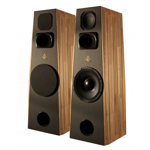 L’enceinte AT31 est une colonne de taille imposante aux caractéristiques en rapport. Enceinte trois voies, elle compte néanmoins quatre haut-parleurs. La section haute est prise par un tweeter à chambre de compression poussé par un aimant surpuissant au néodium. La membrane a été adaptée par rapport aux autres modèles pour maintenir la finesse de restitution avec un rendement démoniaque… Plus de 100 dB pour l’AT31 ! Le médium, situé au-dessus, est traité pour la première fois dans la gamme par un haut-parleur qui lui est dédié, de 16cm. Le grave enfin est assuré par l’impressionnant 31 cm en façade, couplé à son cadet de 26 cm à l’arrière. Ce montage, classique chez Atlantis Lab, permet de conjuguer les qualités souhaitées de rendement, de compacité et de réponse en fréquence très basse. Les quelques 28 Hz vrombissent véritablement quand le boomer frontal et ses accélérations fulgurantes (toujours ce rendement…) entrent en scène. L’AT31 encaisse nominalement près de 200 Watts, 400 en crête. Elle peut véritablement être mariée à toute électronique, comme tout salon d’écoute. Notez, comme ses petites sœurs, que l’évent est réglable. Cette étape, simple mais précise, est recommandée pour obtenir encore plus de l’AT31 au-delà des préréglages d’usine, en fonction de votre pièce d’écoute.