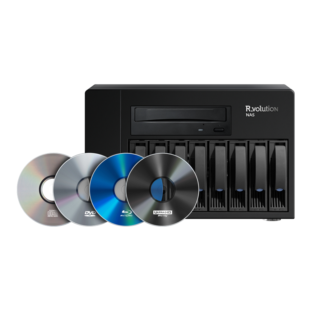 Grâce à une technologie de traitement vidéo performante et à l’application Media Center R_video, le NAS Rvolution vous permet de créer une bibliothèque audio/vidéo dématérialisée à partir de vos disques CD, DVD, Blu-ray, Blu-ray 3D. et Blu-ray 4K UHD. Le NAS Rvolution dématérialise vos musiques et vidéos et les stocke sur des disques durs, sans compression ni perte de qualité. Le NAS Rvolution est hautement évolutif et capable de continuer à fonctionner même après une panne de disque, sans perte de contenu.