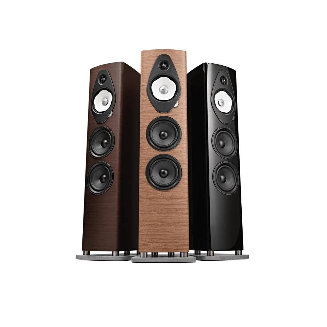 Le design luxueux de l’enceinte Sonus Faber Sonetto V G2 s’associe à une conception acoustique héritée des meilleures enceintes hi-fi de la marque. Celle-ci met en oeuvre trois grands haut-parleur de 16,5 cm de diamètre, dont deux spécifiquement dédiés à la reproduction des basses. Chaque haut-parleur profite d’une membrane en pulpe de papier est montée sur une suspension souple pour maximiser l’excursion sans augmenter la distorsion. Le contour des haut-parleurs adopte un motif en forme de Camelia pour réduire les interférences et améliorer la dispersion du son. La membrane dédiée au médium est laissée non peinte pour garantir une pureté sonore totale. Le double haut-parleur de grave est quant à lui monté en bass-reflex par un évent laminaire frontal, ce qui facilite son placement dans une pièce de vie.