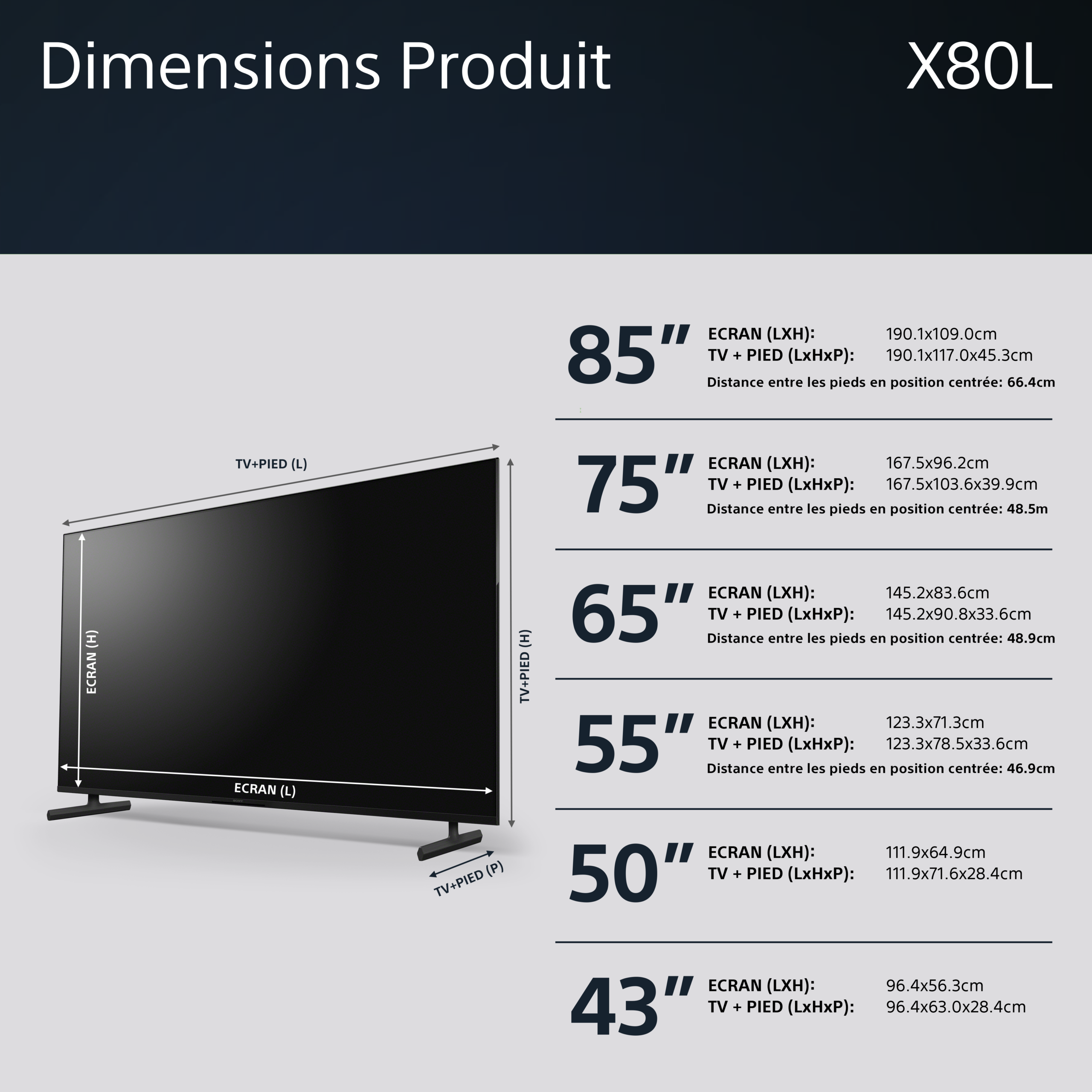 Avec son design minimaliste et son cadre à bords fins, le téléviseur Sony KD-65X80L n’accapare pas votre attention et se fait oublier au profit de l’image affichée sur son écran. Vous plongez sans peine au cœur de votre programme TV, de votre film ou de votre jeu vidéo favori. Très pratiques, ses pieds ajustables sur deux positions facilitent son placement sur n’importe quel meuble TV, qu’il soit large ou étroit. De plus, en position écartée, les pieds laissent suffisamment d’espace entre eux pour y placer une barre de son.